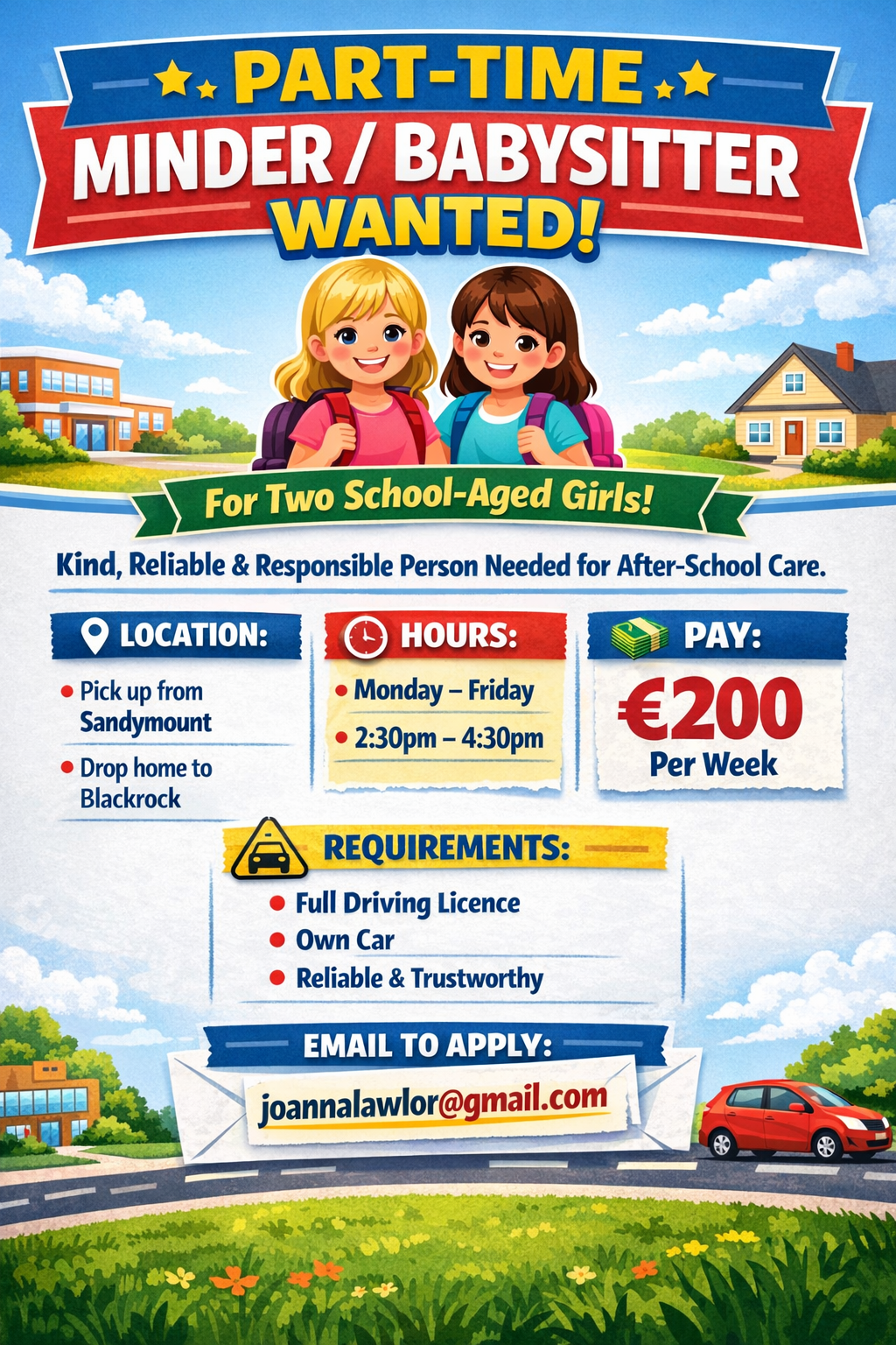 The Family: We are a busy professional household in Blackrock (near DART & buses) seeking a reliable, emotionally mature student to support our nine-year-old daughter. She is bright, funny, engaging, and auADHD. We are looking for someone who views this not just as a job, but as an opportunity to apply their studies in a real-world, neuro-affirming environment.