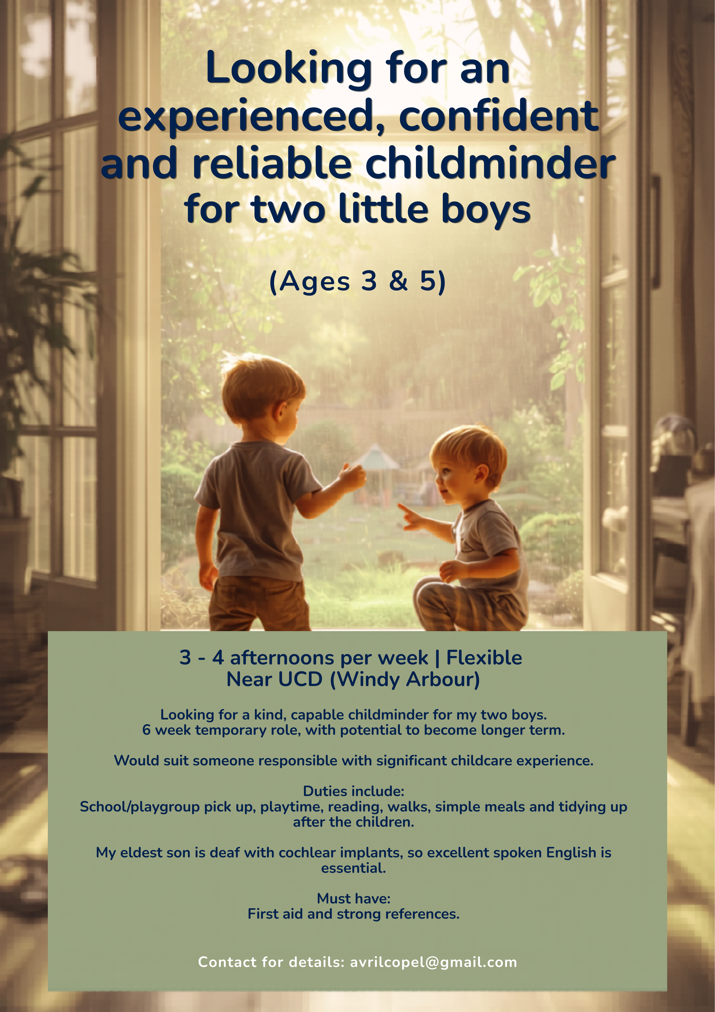 Looking for an experienced, confident & reliable child minder for two little boys (aged 3 & 5)